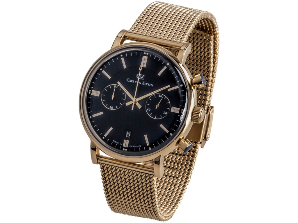 Chronograph Carl von Zeyten CVZ0037GBLM Bühlot Chronograph 44mm 3ATM na Vás zapůsobí mimo jiné i svým nadčasovým vzhledem. zlatá barva řemínku a bezpečnostní skládací spona jsou již pouhou tečkou za dokonalostí tohoto modelu.| Kategorie: | Pánské hodinky |