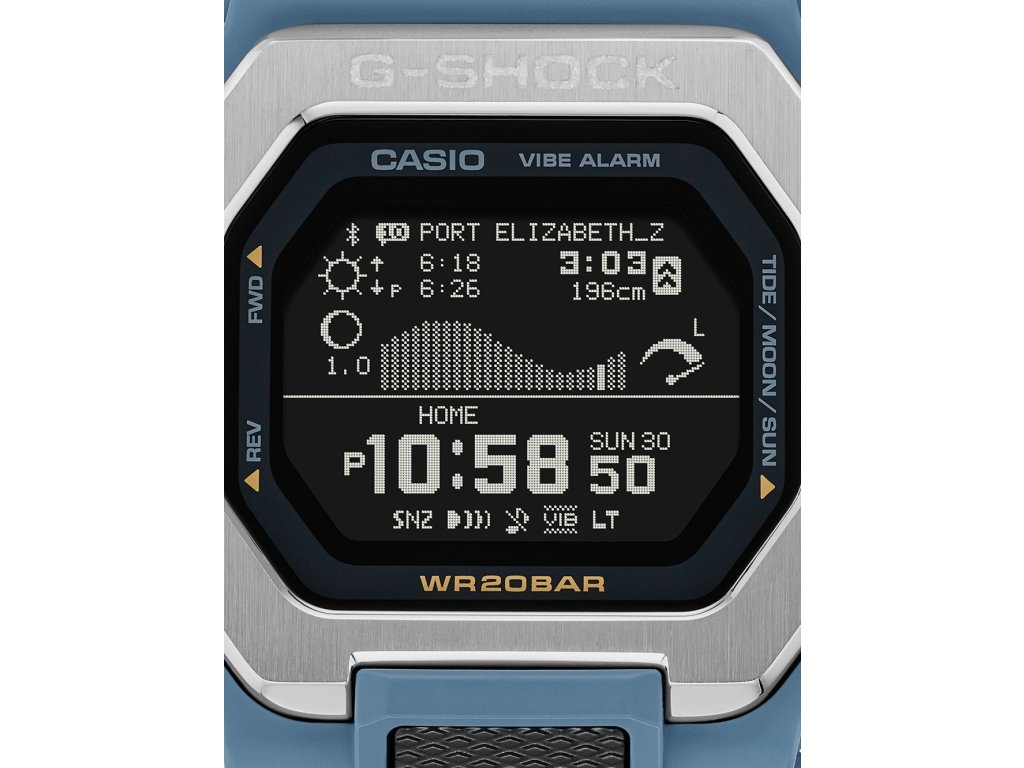 Společenské || Elegantní Casio GBX-100-2AER G-Shock G-Lide Moonphase 46mm 20ATM na Vás zapůsobí mimo jiné i svým nadčasovým vzhledem. modrá barva řemínku a klasická spona jsou již pouhou tečkou za dokonalostí tohoto modelu.