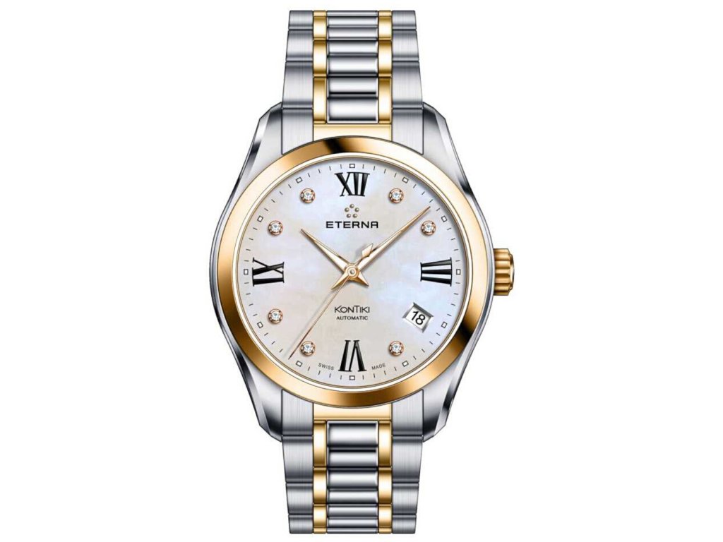Společenské || Elegantní Eterna 1260.53.66.1732 KonTiki Automatic Diamond 36mm 10ATM na Vás zapůsobí mimo jiné i svým nadčasovým vzhledem. stříbrná barva řemínku a motýlek jsou již pouhou tečkou za dokonalostí tohoto modelu.| Kategorie: | Dámské hodinky |