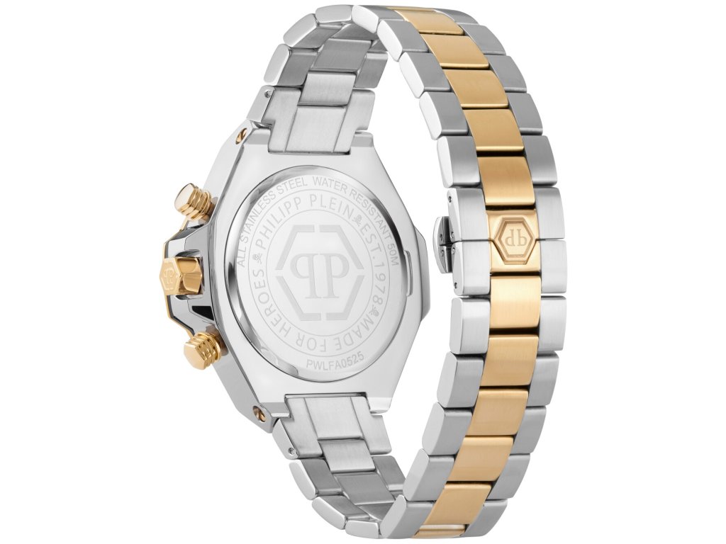 Sportovní Philipp Plein PWLFA0525 Plein Chrono Royal 46mm 5ATM na Vás zapůsobí mimo jiné i svým nadčasovým vzhledem. zlatá || stříbrná barva řemínku a motýlek jsou již pouhou tečkou za dokonalostí tohoto modelu.| Kategorie: | Pánské hodinky |