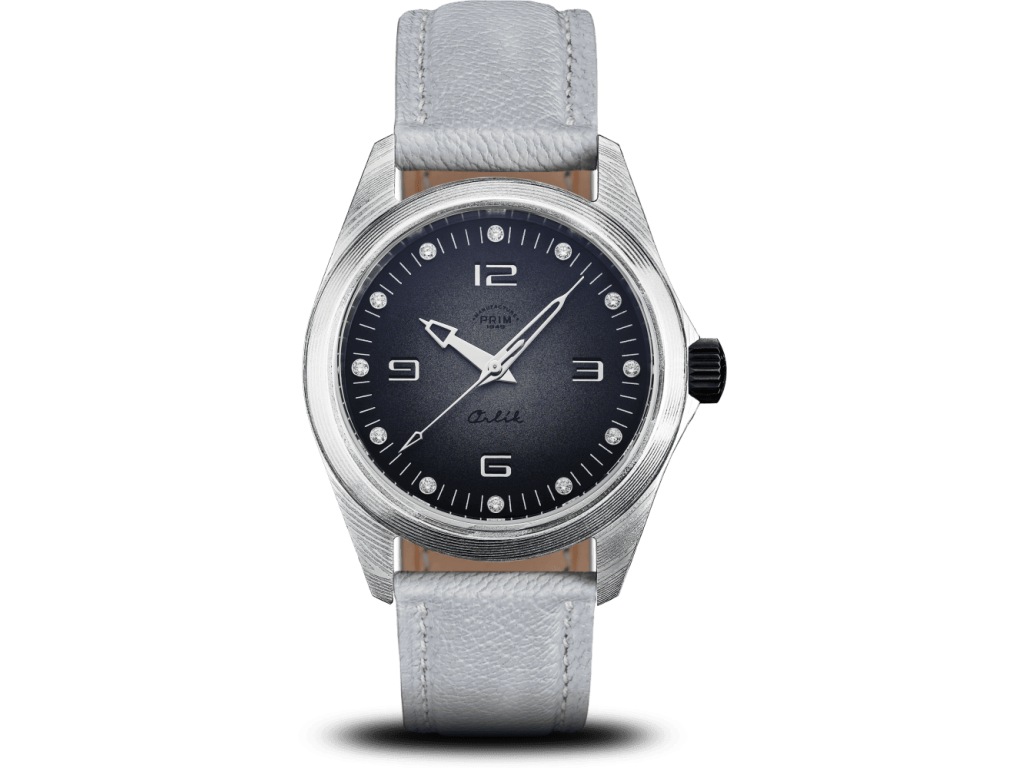 Číselníky jsou ručně lakované, perforované a každý kus je originál. Noblesnější varianta s brilianty ladí s psacím fontem Orlík, technická pak s jeho moderní verzí. V obou případech je strojem vlastní PRIM kalibr 95.00.