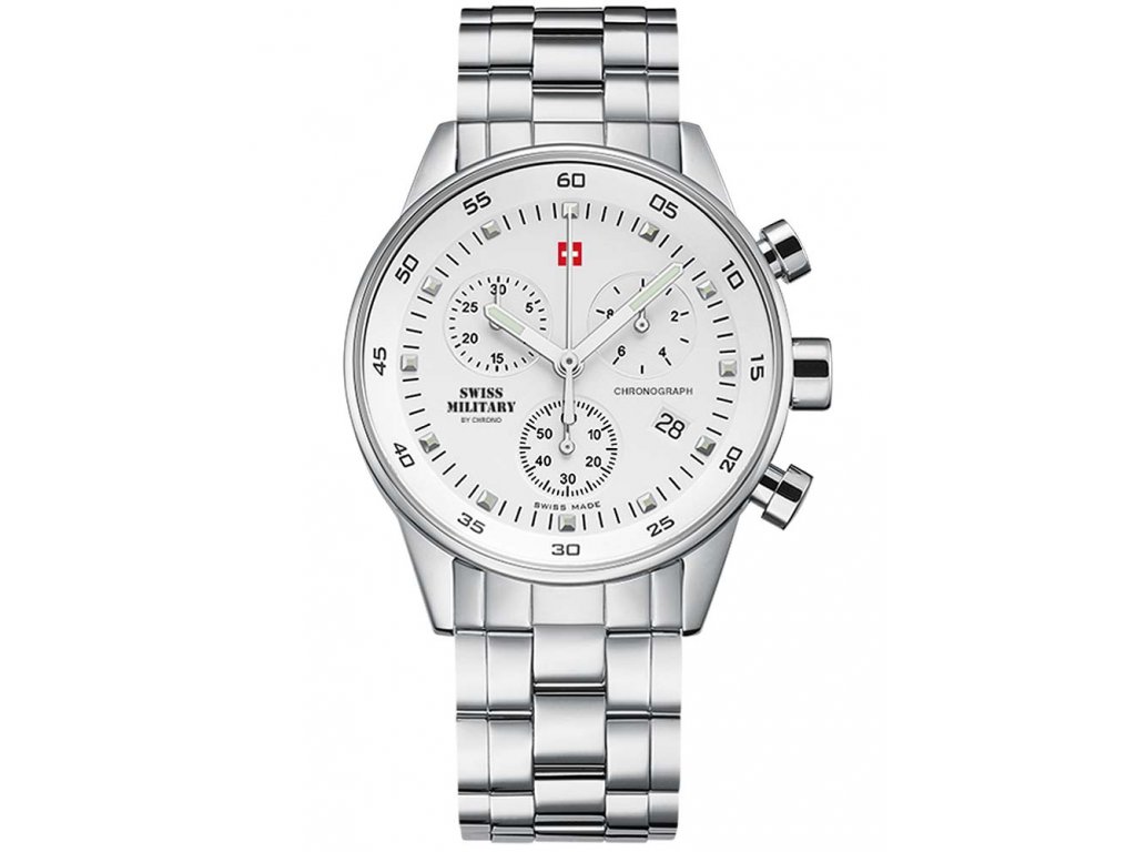 Společenské || Elegantní Swiss Military by Chrono SM34005.02 Chronograph na Vás zapůsobí mimo jiné i svým nadčasovým vzhledem. stříbrná barva řemínku a skládací spona jsou již pouhou tečkou za dokonalostí tohoto modelu.| Kategorie: | Dámské hodinky |