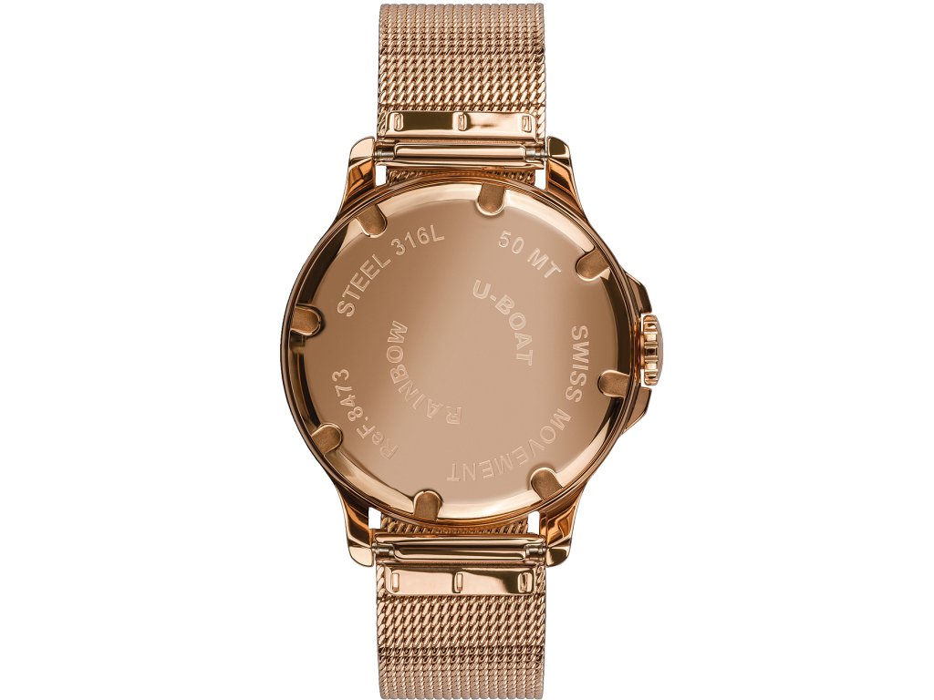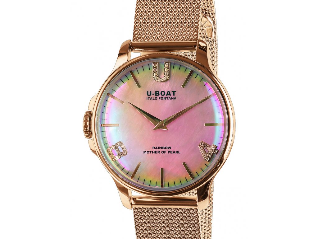Společenské || Elegantní U-Boat 8473/MT Rainbow 38mm na Vás zapůsobí mimo jiné i svým nadčasovým vzhledem. růžové zlato barva řemínku a překlápěcí spona jsou již pouhou tečkou za dokonalostí tohoto modelu.| Kategorie: | Dámské hodinky |